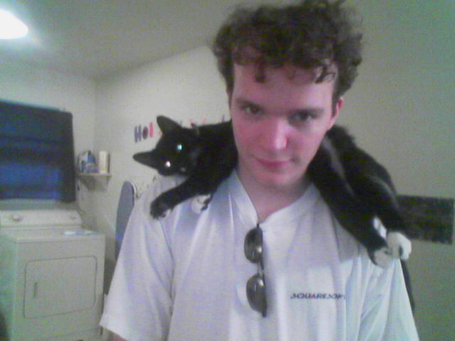 But, there you go. My cat wandering the house by laying across my shoulders.